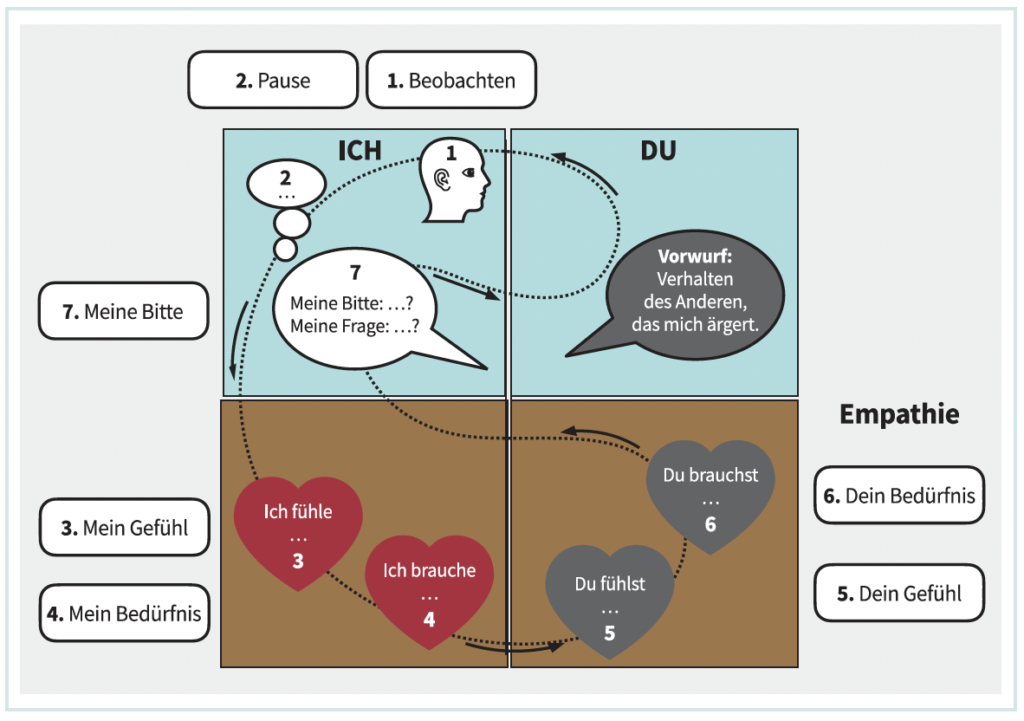 • Konflikte lösen oder Beziehungen verbessern wollen (siehe den Ansatz für empathische bedürfnisorientierte Kommunikation dazu in der oberigen Abbildung)
